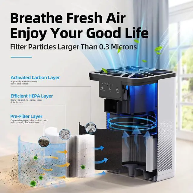 Efficiency Filtration: AROEVE air purifier is equipped with HEPA filters that meet high-efficiency particulate air (HEPA) standards, ensuring efficient filtration of smoke, pollen, dander, hair, and more. By turning on the purifier, you can improve the quality of your indoor air and enjoy a healthier life.