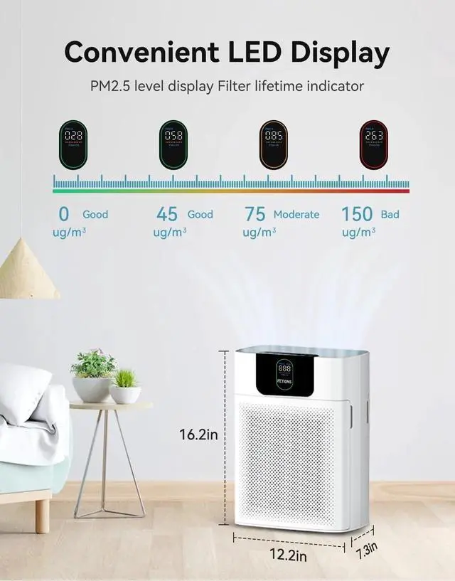 AIR QUALITY MONITOR FOR HOME: FETIONS large room air purifier comes with a touch-on built-in PM2.5 sensor, which can monitor the air quality in real time and feedback to the display screen. When the air quality drops, the indicator will turn to yellow or red with the fan speeding up to clean the air faster