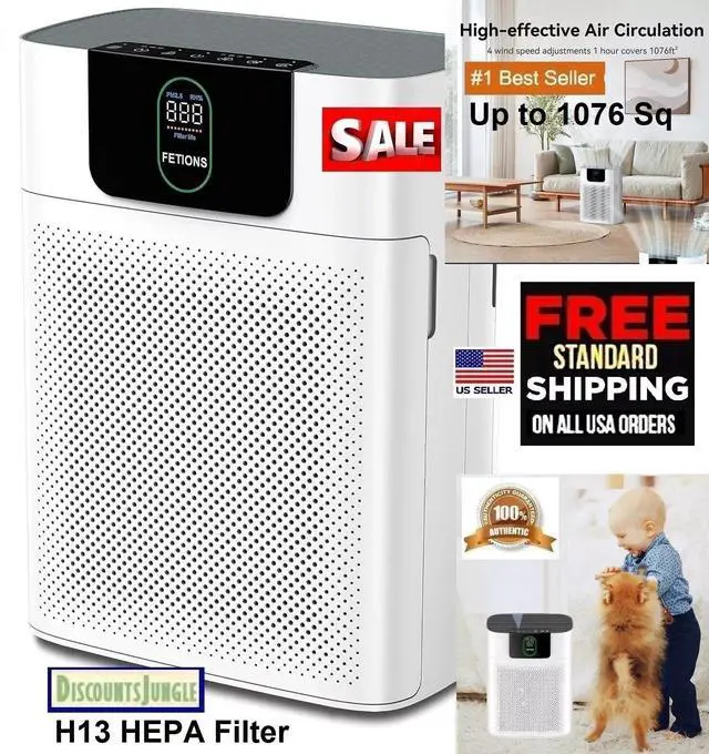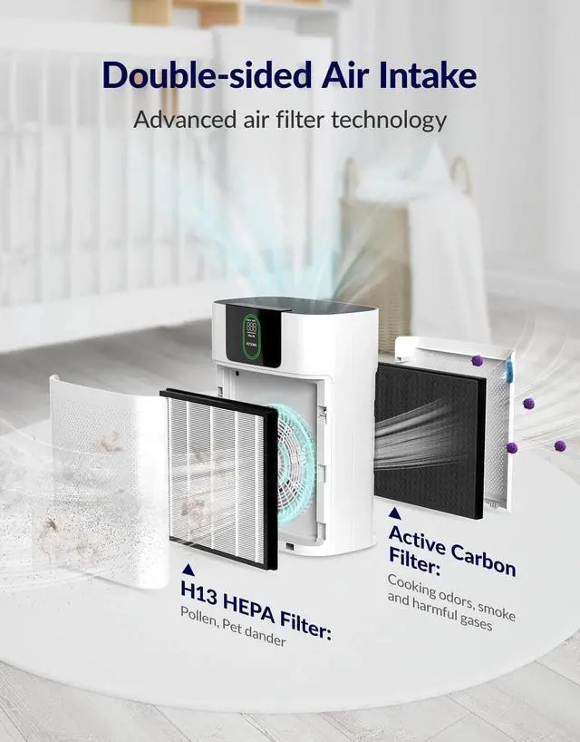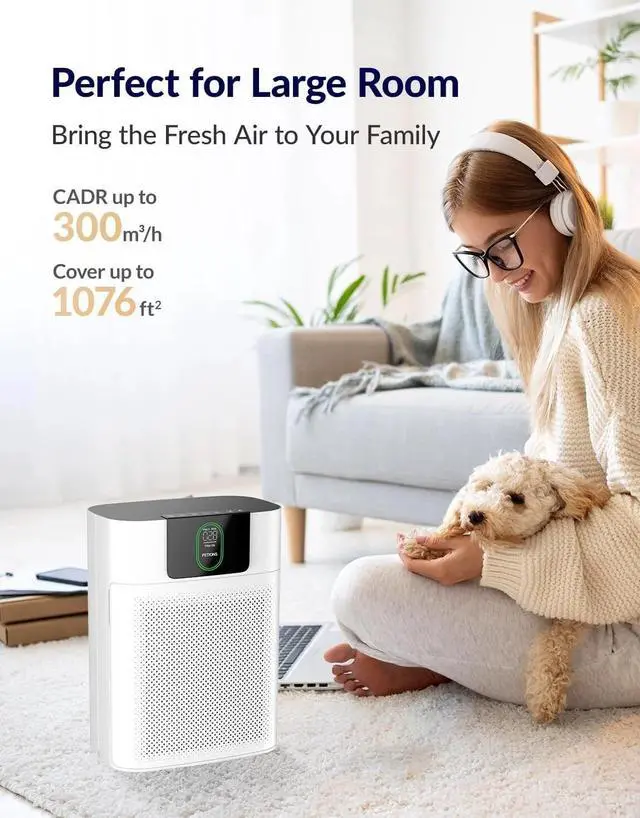 DUAL AIR TREATMENT: FETIONS air purifier for home large room equipped with dual side air inlets design and double-sided H13 True HEPA Filters air purifier system effectively refreshes the air in the room up to 1076 square foot every hour with CADR up to 300m³/h, creating a fresh and clean air environment for your home or office