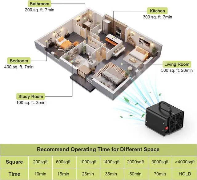 Maximum output of 30, 000 mg/h is suitable for spaces up to 4, 000 sq ft.
