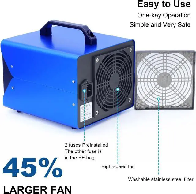 UPGRADE MATERIAL, DURABLE & LIGHTWEIGHT- Ozone ionizer made of lightweight and durable aluminum alloy shell, it weighs only 3 pounds and is equipped with a metal handle for easy carrying. It also has a built-in 2600PRM high-speed fan with noise as low as 40dB and is equipped with 3 replaceable fuses to improve the lifetime of the ozone machine by up to 6 years.