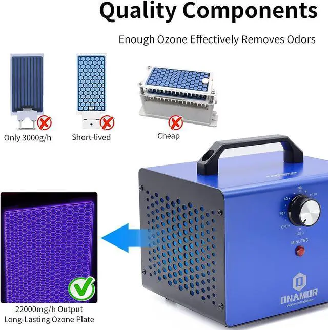 OZONE OUTPUT- This Ozone Generator Ionizer has max ozone output per hour of 22000 mg, meeting the 4000 square feet+ of space. And it has a built-in the latest upgraded ceramic ozone plate, which is sturdy and durable and has a long use life, easy to clean.