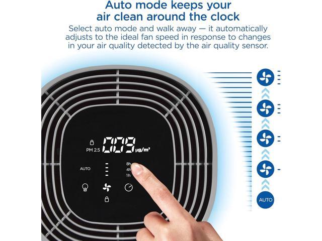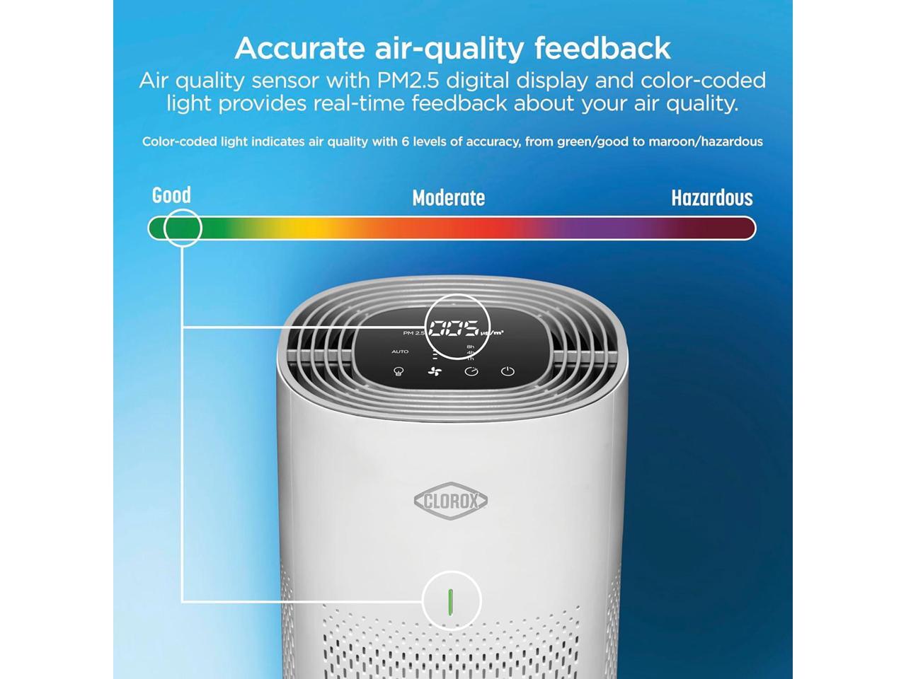 - ACCURATE AIR QUALITY FEEDBACK. The air quality sensor provides real time feedback with a PM2.5 digital display, a color coded light from green/good to maroon/hazardous and by automatically adjusting the auto modes fan speed in response to changes in the current air quality.