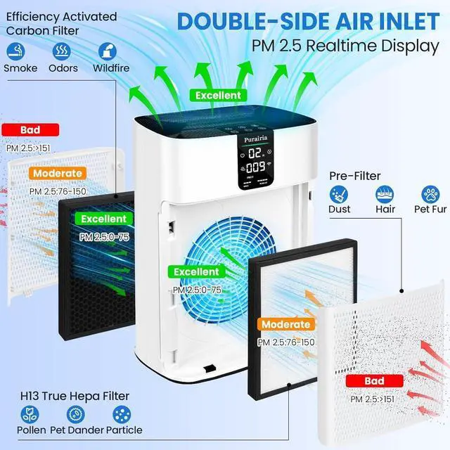 Powerful Air Purifier with 2X Air Inlet for Large RoomsOur air purifier for home large room features a double-sided air inlet design, a feature that makes it unique. With air intake on both sides, the enhanced airflow allows our air purifier to cover large areas with ease. Whether its a spacious living room, a large bedroom, or an open office space, this air purifier can handle it with ease. It circulates the air faster, allowing the fresh air to reach every corner.