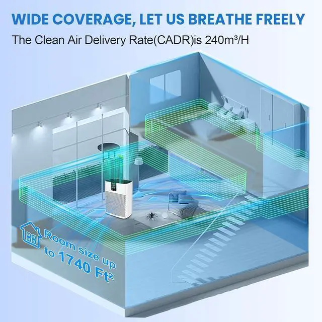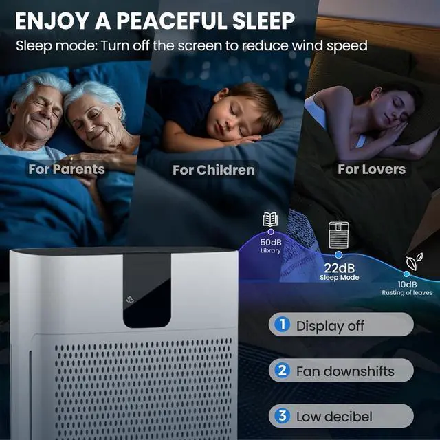 Quiet Sleep Mode, Enjoy Sweet DreamsWith 22dB ultra-quiet sleep mode, our air purifier for bedroom is the perfect sleeping companion. In sleep mode, the air purifier will run at a low speed and the display light will automatically turn off (leaving only a small icon of sleep mode). Whether you are a light sleeper who is easily disturbed by noise, or you value a quiet sleeping environment, the air purifier allows you to enjoy a quiet sleep and ensure fresh air all night long.