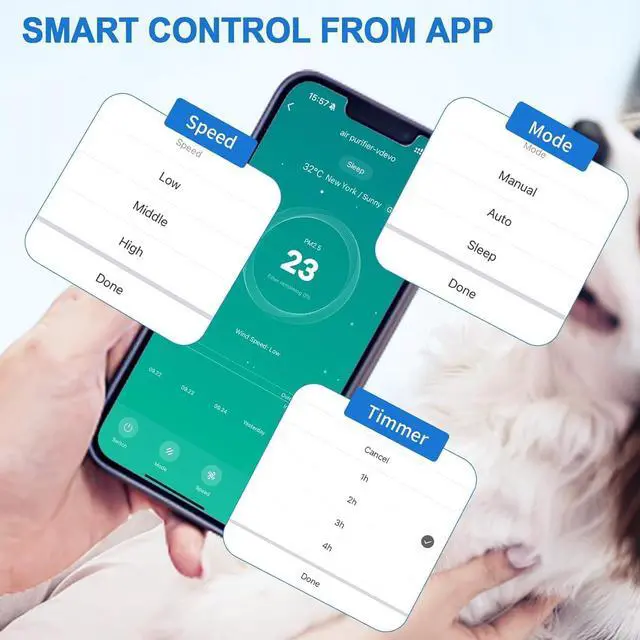 Smart Control with AppYou can set and adjust the True HEPA air purifier through the mobile application. The APP provides a variety of settings such as timer (1-12Hours), fan speed (3 Speeds), mode selection (Sleep/ Auto/ Manual Mode), and you can monitor the air quality and filter life on your phone at any time.
