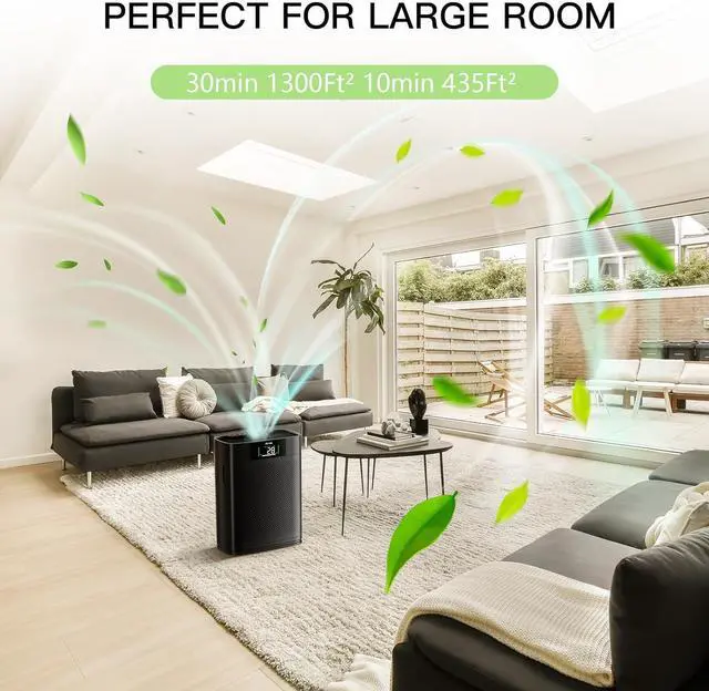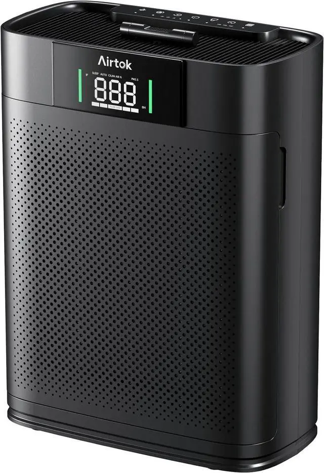 LARGE COVERAGE: The air purifier is perfect for large, indoor spaces, especially large bedrooms. The air purifier has a powerful filtration system that can remove particles as small as 0.3 microns, including dust and pollen. It can purify the air of a 1300 ft² space once/hour (based on AIRTOK Original Filters; not applicable to other replacement filters)