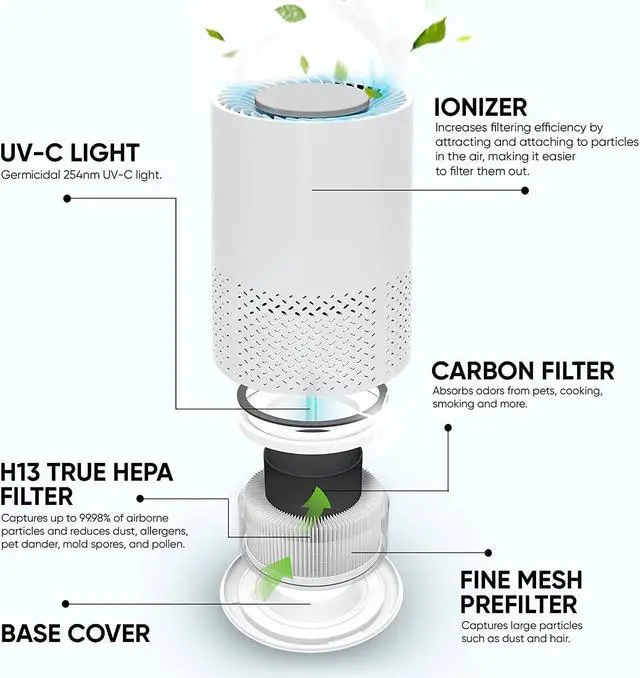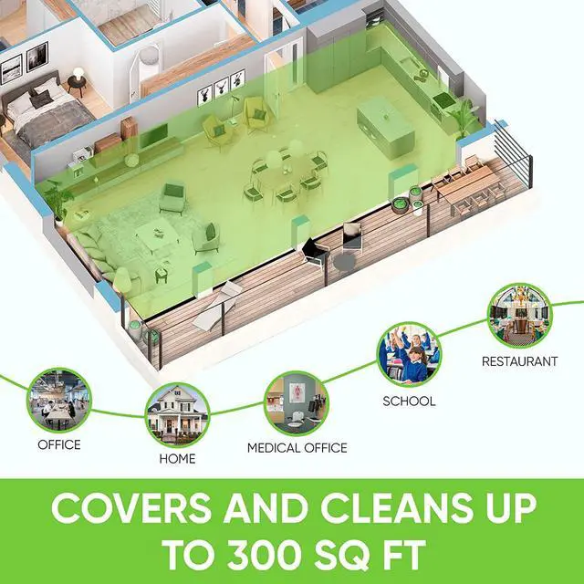 : Our air purifiers for office desktop feature easily replaceable H13 99.98 % True HEPA Filters with Activated Carbon Pre-Filters plus an optional Ionizer and a UV-C Light feature. This home air purifier for dust covers up to 300 sq. ft (1 air change per hour) and 75 sq. ft (4 air changes per hour).