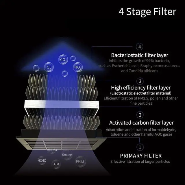 Double-Rotating Air Purification Duct: Portable car air purifier adopts a 4-stage filtration system. High-efficiency filter layers remove 99.9 % of harmful gaseous substances such as car exhaust fumes, chemicals emitted by plastic materials, and other odor-emitting substances (volatile organic compounds (VOCs), toluene, and formaldehyde are even more down to 0.1 microns in size