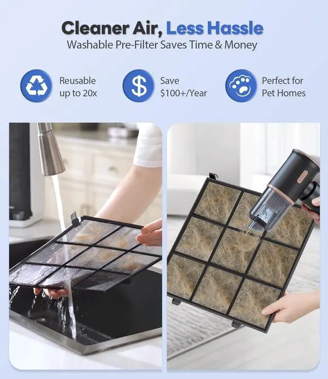 : The washable pre-filter captures dust, hair, and pet dander, keeping the main filter cleaner for longer.