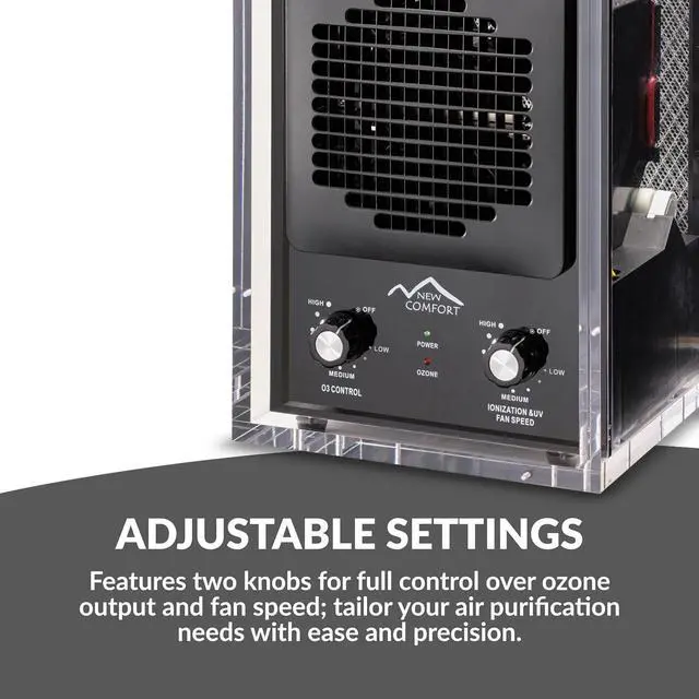 ADJUSTABLE SETTINGS: Features two knobs for full control over ozone output and fan speed; tailor your air purification needs with ease and precision.