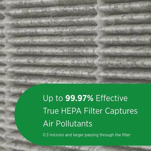 • CAPTURES UP TO 99.97% OF AIRBORNE ALLERGENS & VIRUS-SIZE PARTICLES 0.3 microns and larger passing through the True HEPA filter, including viruses, bacteria, pet dander, pollen, mold spores, and other airborne impurities