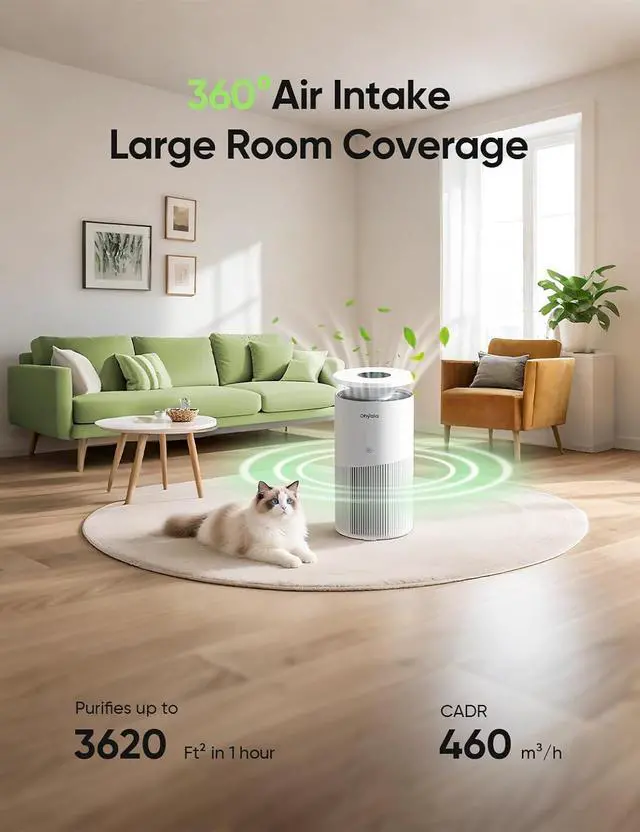 . : Dhyala air purifier for home large room adopts 360° wide grid and accelerated design, providing greater wind pressure and speed. With a CADR of 271 CFM, it can clean air in spaces up to 3620 sqft in just one hourperfect for bedrooms, living rooms, and open floor plans. (Based on independent testing by ISO 17025 certified laboratories and the ventilation volume of typical residential rooms in 2025).