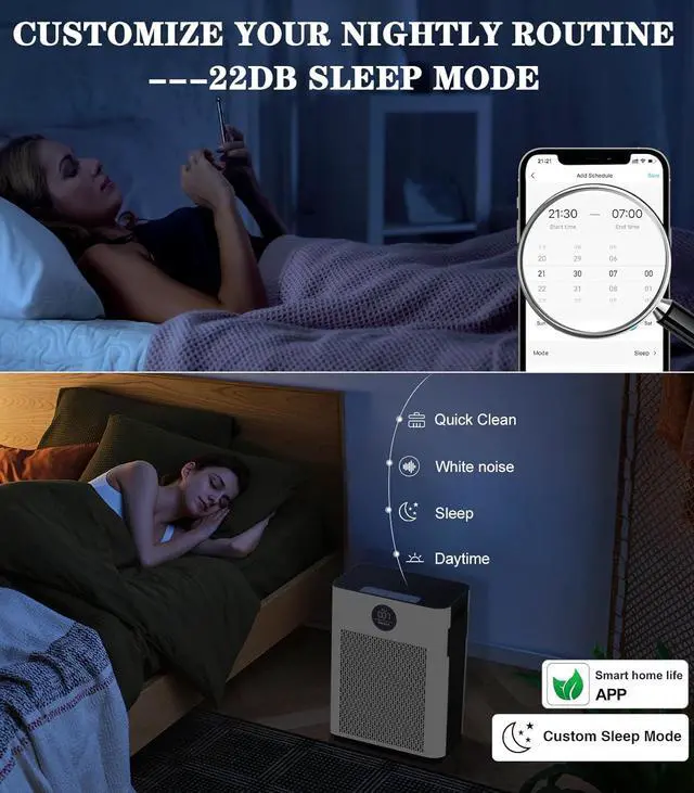 Silent Guard Night ModeWith a noise level as low as 22dB in sleep mode. It can create a tranquil and relaxing bedroom environment while providing reliable air purification effects. Enjoy fresher air while sleeping without interruption.