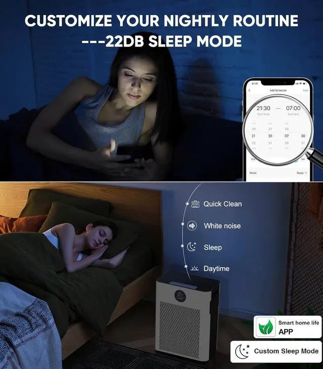 Silent Guard Night ModeWith a noise level as low as 22dB in sleep mode. It can create a tranquil and relaxing bedroom environment while providing reliable air purification effects. Enjoy fresher air while sleeping without interruption.