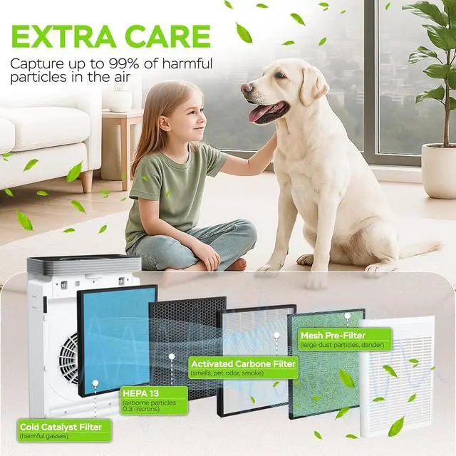 Advanced H13 HEPA Filtration: Captures 99.97% of airborne particles as small as 0.3 microns, including dust, pollen, pet dander, smoke, and bad smellsperfect for pet owners or basements.