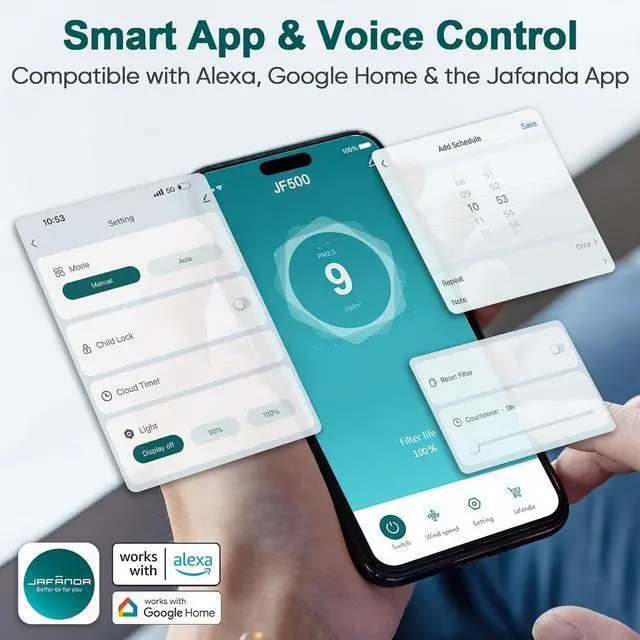 Smart Home Integration for Easy Control:Connects to your phone via app Jafanda (iOS/Android) to adjust fan speeds, check filter life, and monitor air qualityeven when youre away. Works with voice assistants (Alexa/Google Assistant) too: just say Hey Alexa, turn on the JF500 air purifier for hands-free convenience