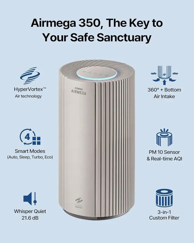COWAY Air Purifier for Large Room Whole Home Up to 2,640 ft², HEPA Filter for Smoke, Allergen, Pet Dander, Odor, PM 10 AQI, Turbo Eco Mode, Timer, Energy Star, 3yr Warranty, Airmega 350 Beige