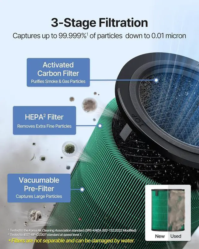 [HyperCaptive Filtration System] Dynamic combination of a washable pre-filter, activated carbon filter, and HEPA Filter effectively reduces 99.97% of 0.3 micron particles in the air, including pollen, pollutants, and other allergens. It also reduces 99% of volatile organic compounds and odor.