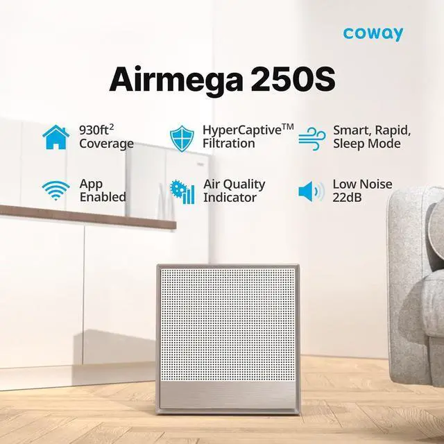 COWAY Air Purifiers for Home Large Room Up to 1,860 ft², Washable Pre-Filter and HEPA Filter for Smoke, Allergies, Pet Dander, Odor, AQI, App Control, Smart, 3yr Warranty, Airmega 250S Wifi