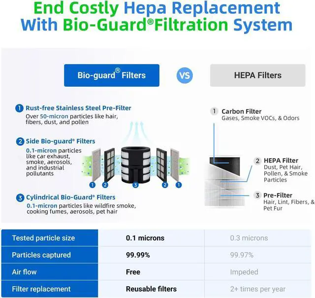 DUAL 4-STAGE FILTERATION The stainless-steel prefilter captures large particles. The ozone emission removal filter eliminates toxic ozone. 2 patented Bio-Guard Filters & the Bio-Guard 360 Filter remove harmful airborne particle pollutants and odors.