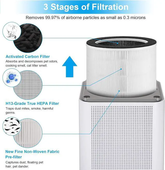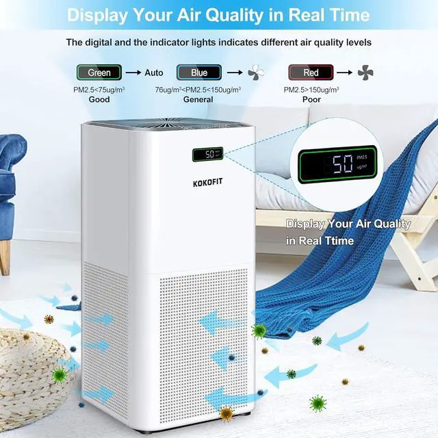1. H13 True HEPA Air PurifierThe Kokofit Air Purifier employs advanced HEPA technology to effectively filter particles as small as 0.3 microns and larger, as well as reduce PM 2.5 air pollution. It successfully removes 99.97% of airborne contaminants such as dust, pollen, smoke, odors, and pet dander. This creates a healthier family environment, enhances indoor air quality, safeguards children and the elderly from harmful pollutants, and is particularly suitable for pet owners.