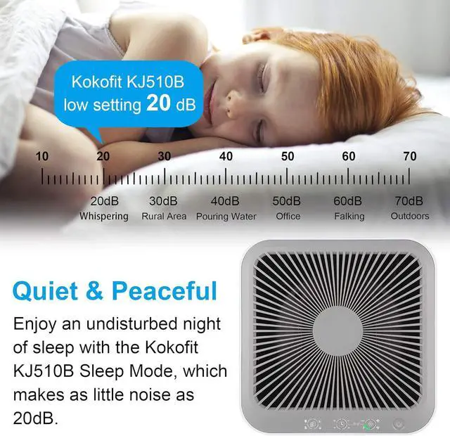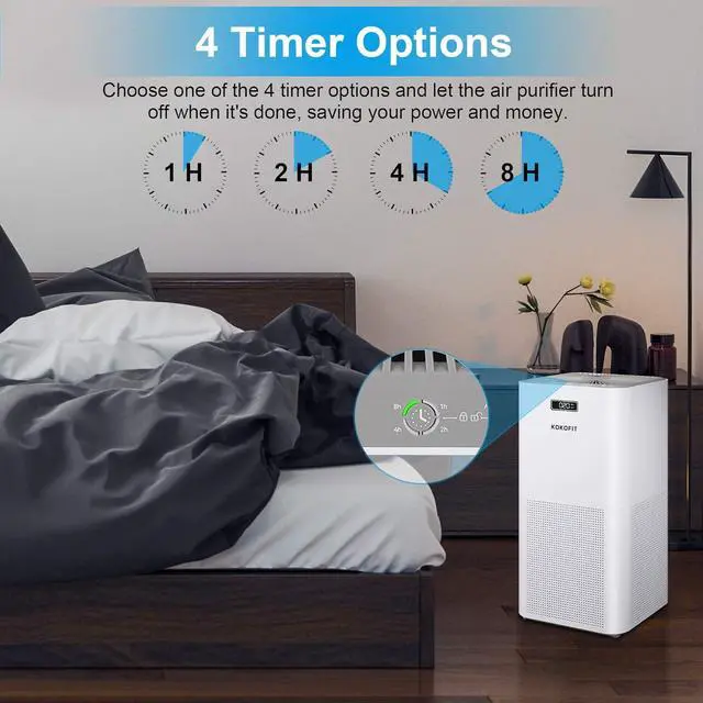 4. Sleep Mode & Child Lock Mode & 4 Timer OptionsIn sleep mode, Kokofit air purifiers for bedroom purifies the air at only 25dB, ensure a flow of fresh air without noise, will not disturb your learning, working or sleeping. Child Lock Mode is efficient to avoid error operation caused by pet or child's during their curiosity. Keep pressing the Timing Button and Wind Speed for 3 seconds to start it. While equipped with 4 timer options to save energy and electricity bills.