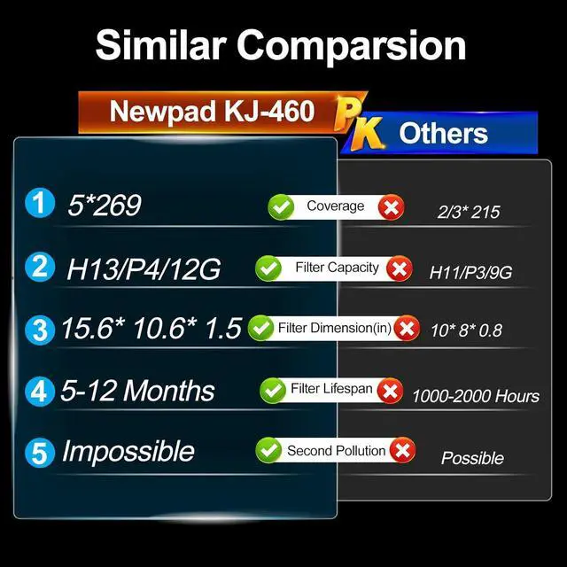 Durable Replacement Filter - Unlike other small and poor filters with 1000-2000 hours life, our filter can last at least five months even if you run it 7/24, or even a year if you make a reasonable schedule with the APP. Search for 'B0BJZPMW53' or 'newpad replacement filter for KJ-460' to get the official replacement filter.