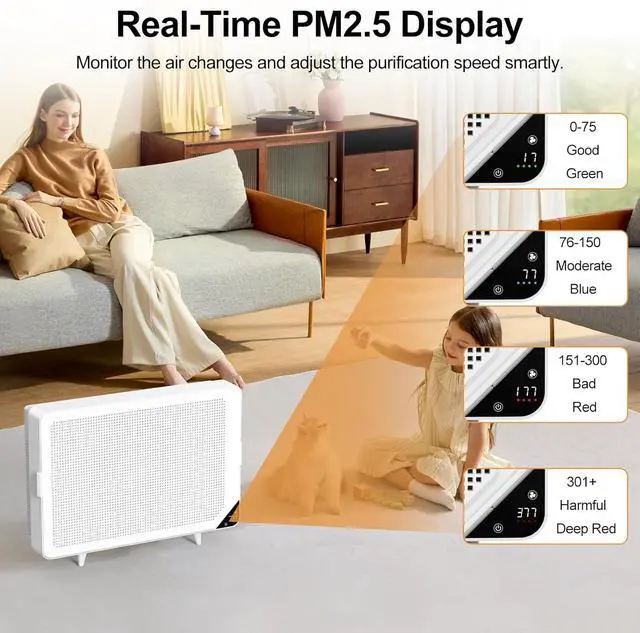 Wall Mount/Floor Stand/Desktop Air Purifier - This room air purifier is designed to be mounted on the wall or placed on the desk and floor, refresh the air of a 269 sq ft room in 12 min and a 1345 sq ft whole house in one hour, ideal for home large room, bedroom, dorm room, office, living room, apartment etc.