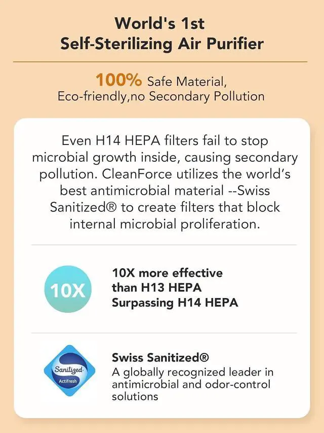AllerSync Filter with Swiss Sanitized HEPA Reinvented Standard HEPA traps but cant stop bacteria growth inside. CleanForce uses Swiss Sanitized antimicrobial tech to block microbial growth and odorslasting longer with no re-pollution. This performance can only be achieved with genuine CleanForce filters