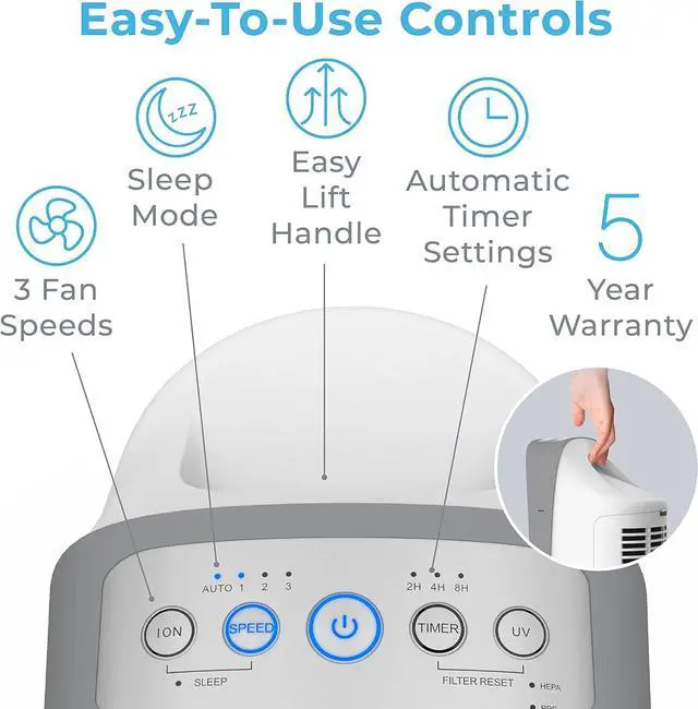 Easy to Use: PureZone Elite uses air quality detection technology that automatically adjusts the three fan speeds in real time, keeping you informed with our color-coded light display. Theres also a filter reset indicator that lets you know when its time to change the activated carbon pre-filter and medical-grade true HEPA filter.