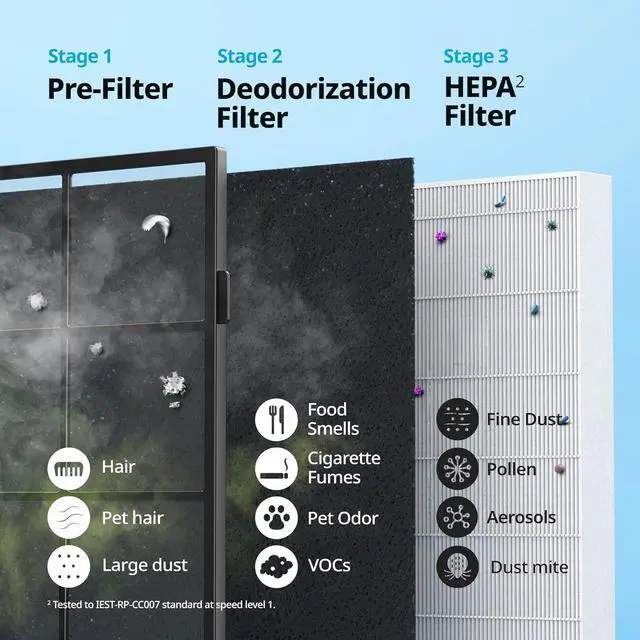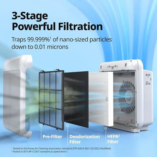 [HyperCaptive Filtration System] Combination of a pre-filter, deodorization filter, and HEPA Filter reduces 99.97% of 0.3 micron particles, including pollen and other allergens. It also reduces 99% of volatile organic compounds and odor.