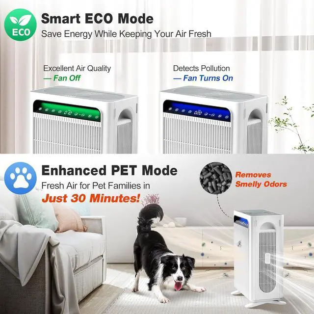 & : PET Mode increases airflow to tackle pet hair, dander, and odors, refreshing the air in just 30 minutes. ECO Mode saves energy and extends filter lifespan by entering standby when air quality is excellent, then restarting automatically when purification is required.