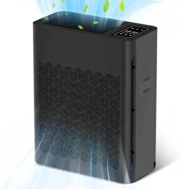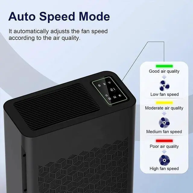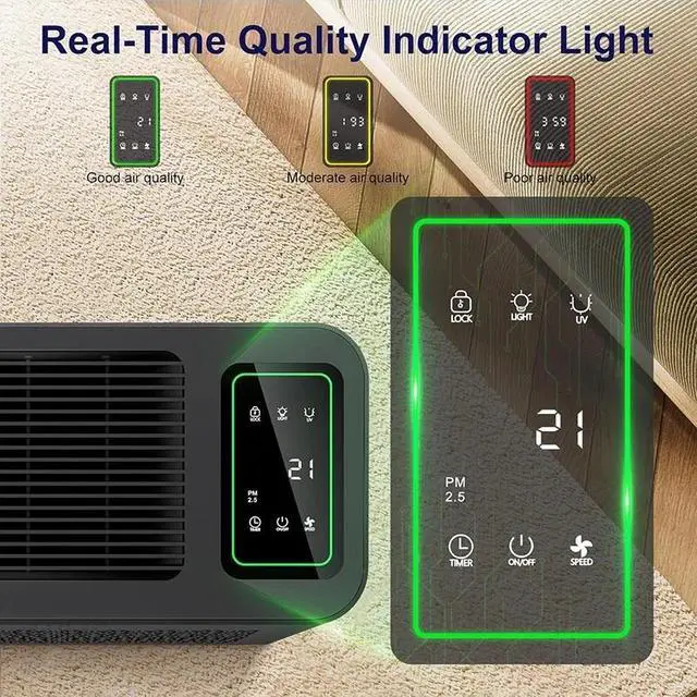 SMART AIR PURIFIER: This air purifier has a real-time air quality indicator that shifts from green to yellow or red, automatically adjusting the fan speed. Green means good air quality (low speed), yellow indicates moderate (medium speed), and red signals poor air quality (high speed)