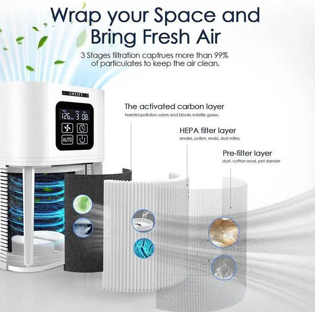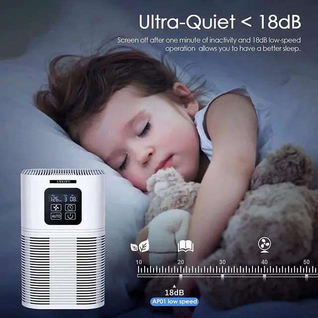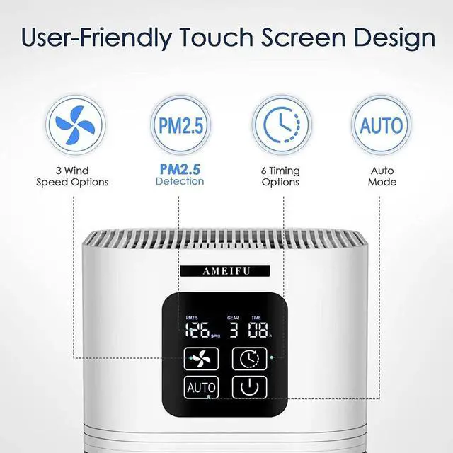 EFFICIENT H13 PURIFICATION: Equip with H13 True HEPA filter and high-efficiency system, AMEIFU air purifier filt 99.97% of dusts, and different types of particles, such as bad odors, air pollution, smoke, leaves the air in your home healthy and pure. It can refresh air per hour for a room as large as 376.74 sq ft / 35 m², and you can enjoy a new comfortable air environment every moment of the day.