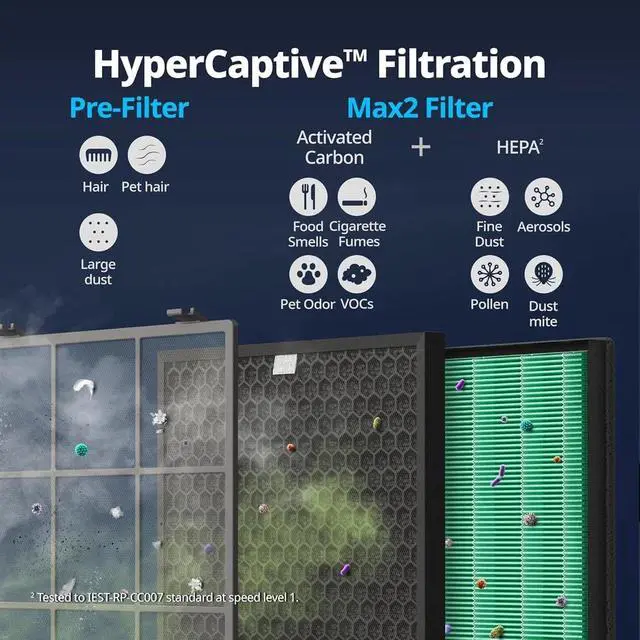 1.Airmega Air Purifiers, tested by KCL(Korea Conformity Laboratories), demonstrate effective capture of 0.01 ultra-fine particles and allergens according to Korea Air Cleaning Association standards (SPS-KACA 002-132:2022 Modified). Performance may vary in your environment. 2.Our HEPA filter complies with IEST-RP-CC007 standards at speed level 1 as tested by SGS (Société Générale de Surveillance). SGS's test report only reflects SGS's evaluation of the sample and does not reflect the evaluation of the batch of goods from which the sample was taken. 3.Tested for acetic acid reduction rate by KCL(Korea Conformity Laboratories) in a chamber under JEM 1467: 2015 conditions for 60 minutes. Results may vary in different environments. 4.Activated Carbon Filter was tested by KCL(Korea Conformity Laboratories) and shown to reduce various harmful gases and odors within 30 minutes, including key VOCs and pollutants. Results are based on lab conditions and may differ in actual use. 5.Allergen filter media was tested by Nichinichi Pharmaceutical to measure allergen concentration using ELISA over a 24-hour reaction period. The test reflects the filter media's performance under laboratory conditions and results may vary in actual product usage environments. 6.Tested reduction rate of ammonia and hydrogen sulfide for 30 minutes under EL608:2023 condition by KCL(Korea Conformity Laboratories). Results may vary in different environments. 7. Tested by Intertek, reduction rates of Naphthalene, Sulfur Dioxide, and Nitrogen Dioxide were tested following JEM-1467:2015 standards. Actual performance may vary depending on the living environment.