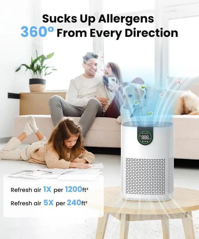 3 Timer & Child Lock- This air purifier large room is equipped with 3 adjustable timer, simply select your runtime (2, 4, or 8 hours) and let the purifier do the rest. The purifier quietly cleans your air as you fall asleep and then turns itself off, ensuring absolute silence for deep rest and zero electricity waste. Besides, it also specially designed with a child lock function in order to prevent accidentally tampering by babies or pets, giving you one less thing to worry about.