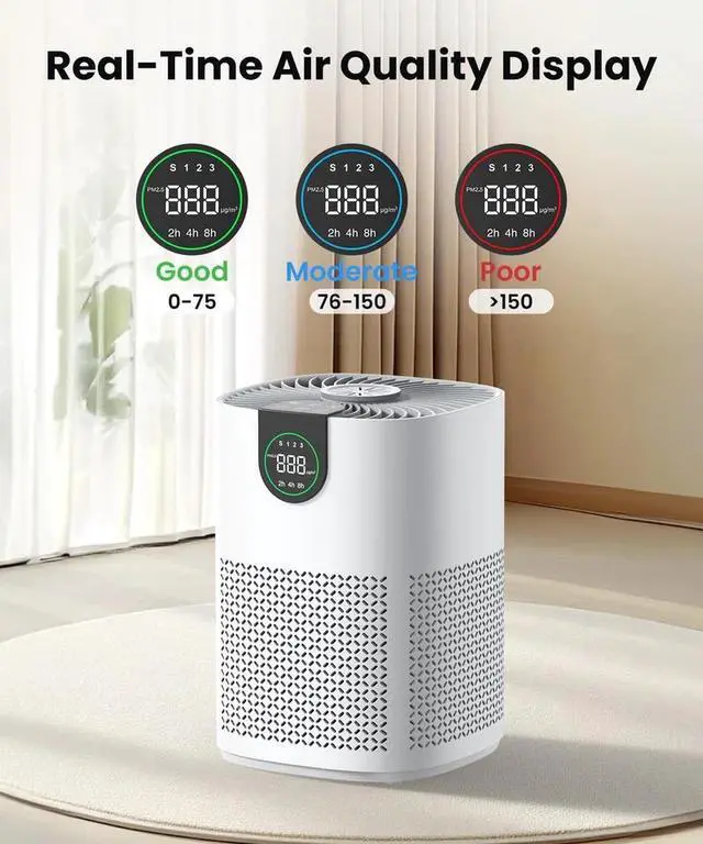 Real-Time Air Quality Display & Auto Mode- The home air purifier features a built-in air quality sensor that monitors ambient air quality in real time and accurate displays PM2.5 levels and air quality lights on the display, allowing you to keep informed.In auto mode, the air purifier will automatically adjust the wind speed according to changes in air quality to achieve the best purification effect, without the need for manual adjustment.