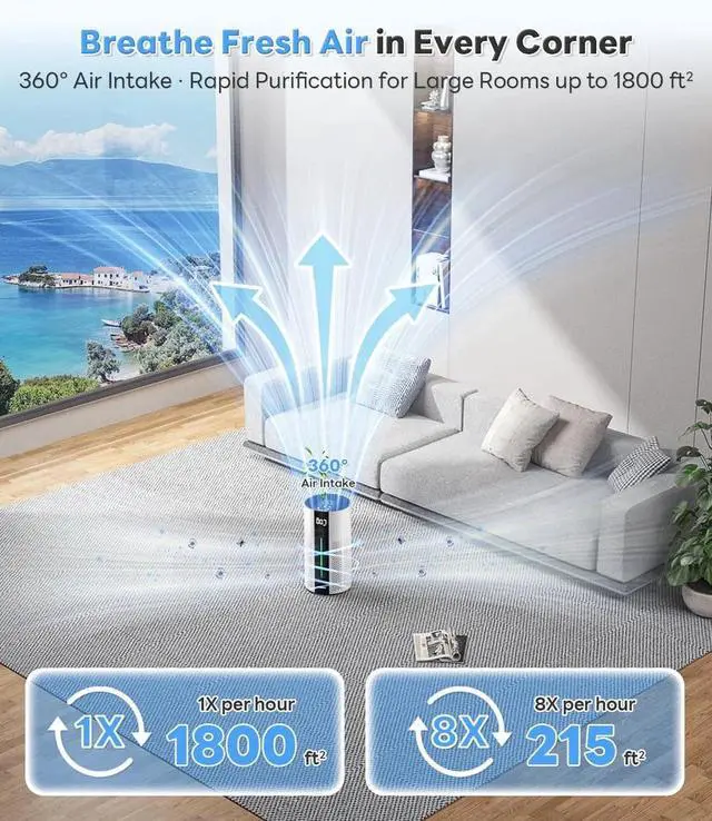 360° Air Intake for Faster Cleaning:The air purifier pulls in air from all directions more efficiently. Its 360° intake boosts airflow and refreshes your entire room in less time.
