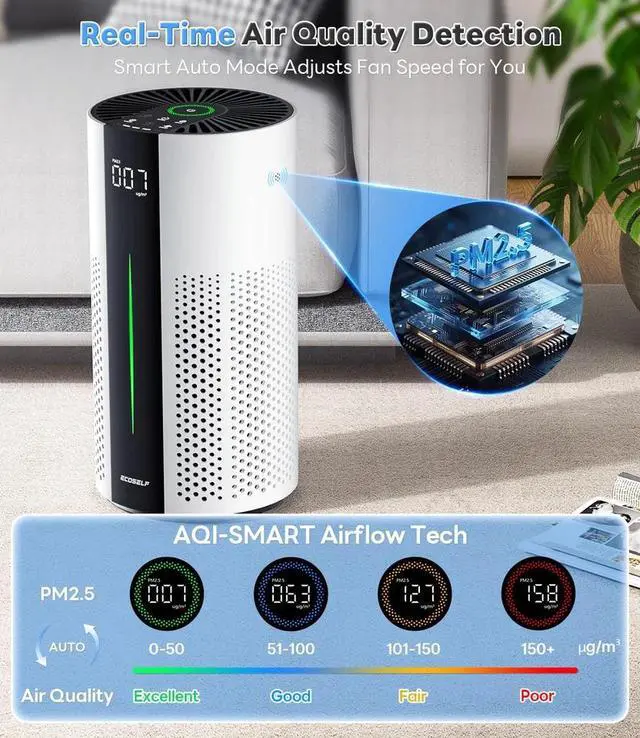 See Your Air Quality in Real Time:The air purifiers for home large room tracks indoor pollutants in real time and shows the results at a glance. The display provides clear PM2.5 readings, while the color ring shifts from green to blue, amber, or red to tell you instantly when your air is cleanand when it needs quick purification.