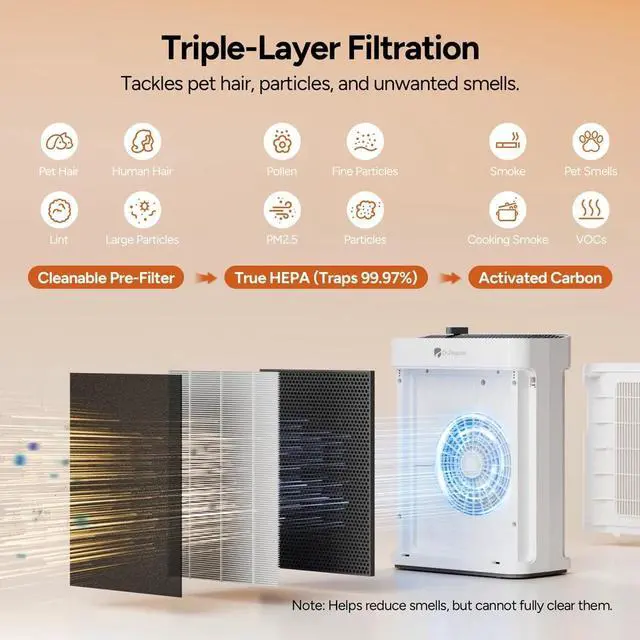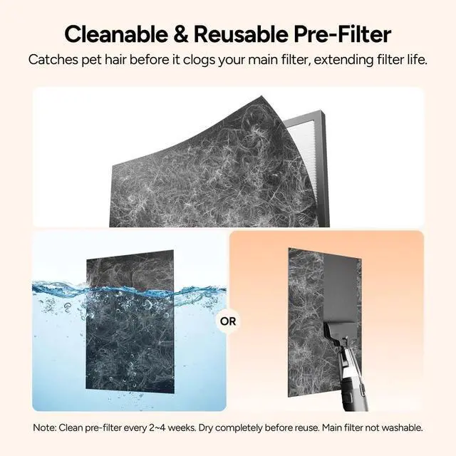 Washable Pre-Filter, Save Costs The cleanable pre-filter captures pet hair and dander before they reach the main filter, preventing clogging and extending the lifespan of your filtration system. It helps reduce filter replacement costs by minimizing the need for frequent changes. Clean the pre-filter every 2~4 weeks to maintain optimal performance and enjoy easier, cleaner breathing.