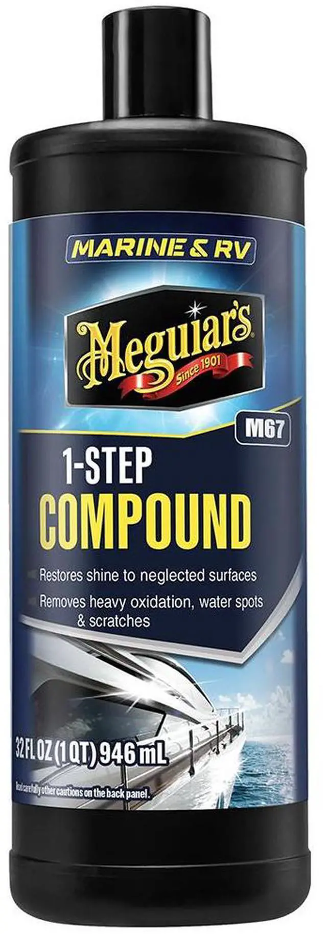 Meguiars Marine One-Step Compound is an advanced, aggressive compound that is safe to use to clean and restore gel coat surfaces. Works in one step to remove moderate to heavy oxidation, scratches, stains, and tough water spots. Will restore color and leave a rich gloss on the treated surface. Can be used by hand or machine to provide incredible results.