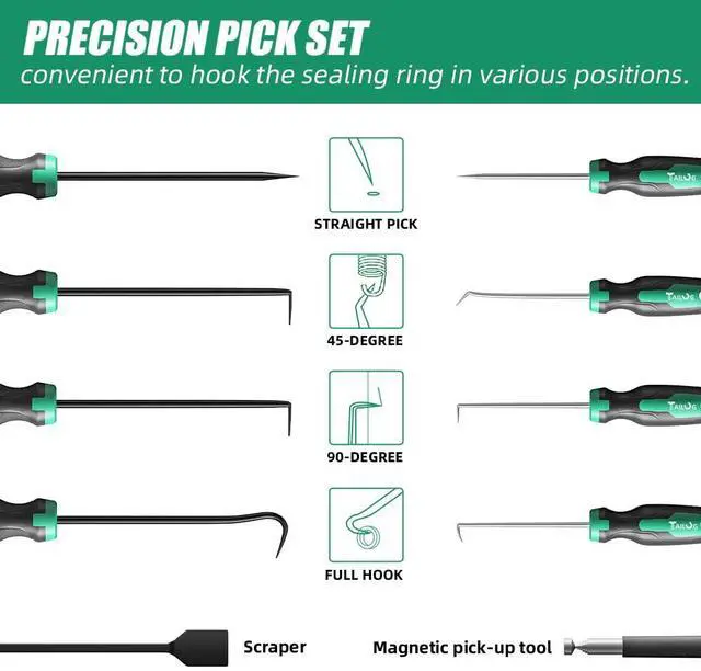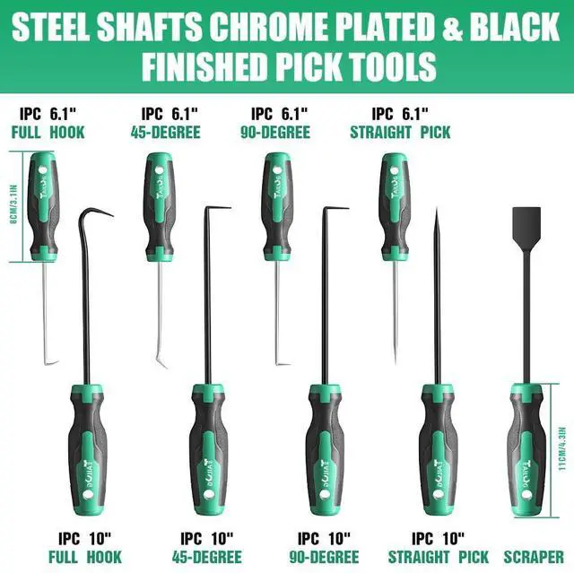 UNIQUE SHARP TIPDesigned with sharp tip, perfect used for removing hoses, moldings, clips, clamps, seals, O-rings, cotter pins, gaskets and more too small to pick up with your fingers. Each hook and pick has an extended length that allows you a deeper reach into tight spaces.