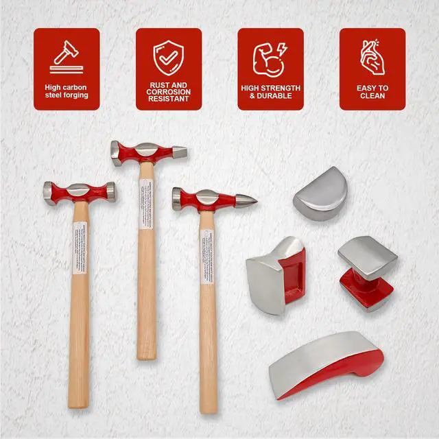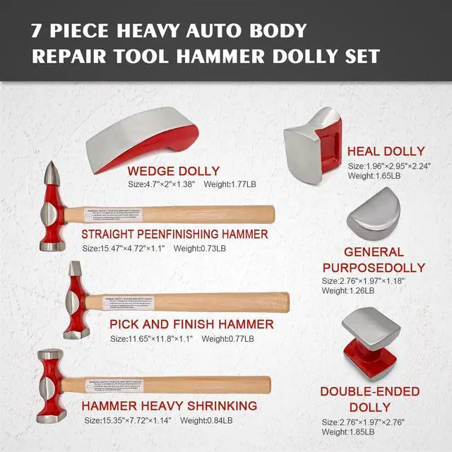- * [AUTOBODY REPAIR]: Hammers and dollies included are suitable for flattening metal panels, removing dings and dents, creating outside curves, and shrinking metal for auto repairs in the garage or at home.