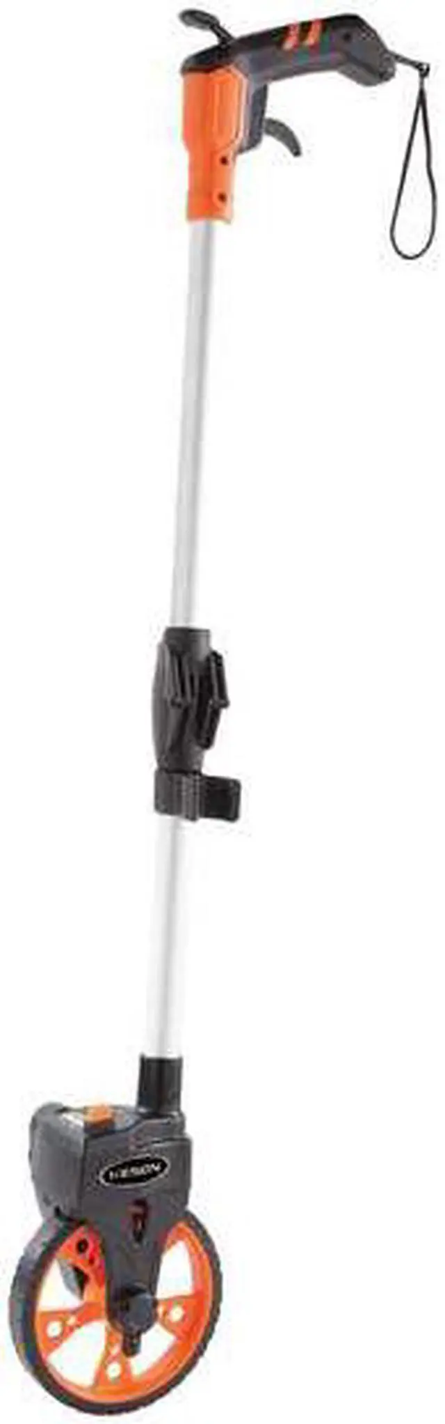 This measuring wheel is designed for measuring ground distance in various applications. It displays measurements on a mechanical readout. Measuring Wheel, Spoke, 1.5 ft Circ, ft./in