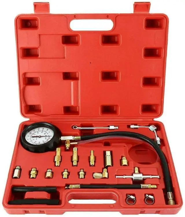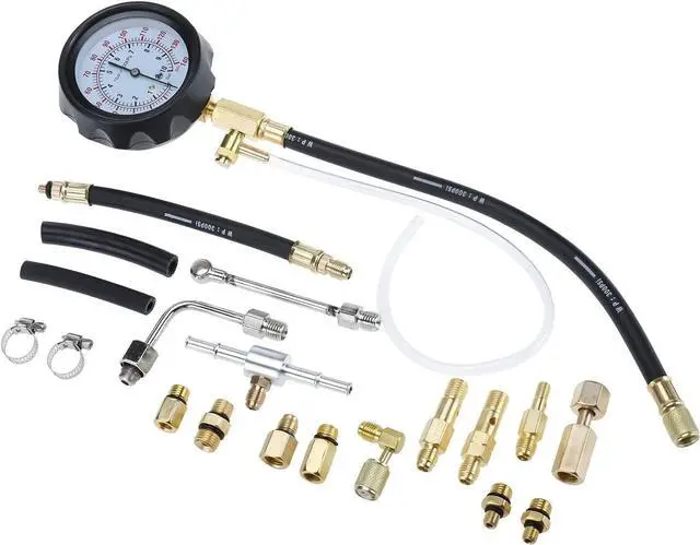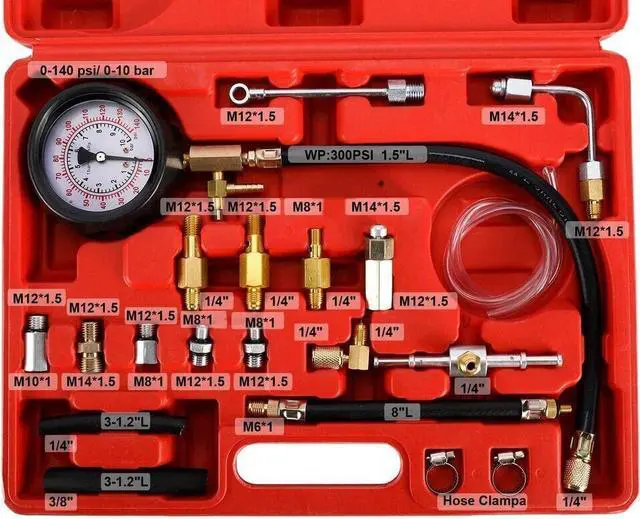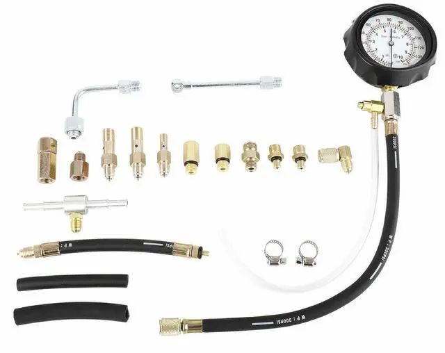 Comprehensive kit of adaptors and fittings for modern Schrader test port fuel injection systems.