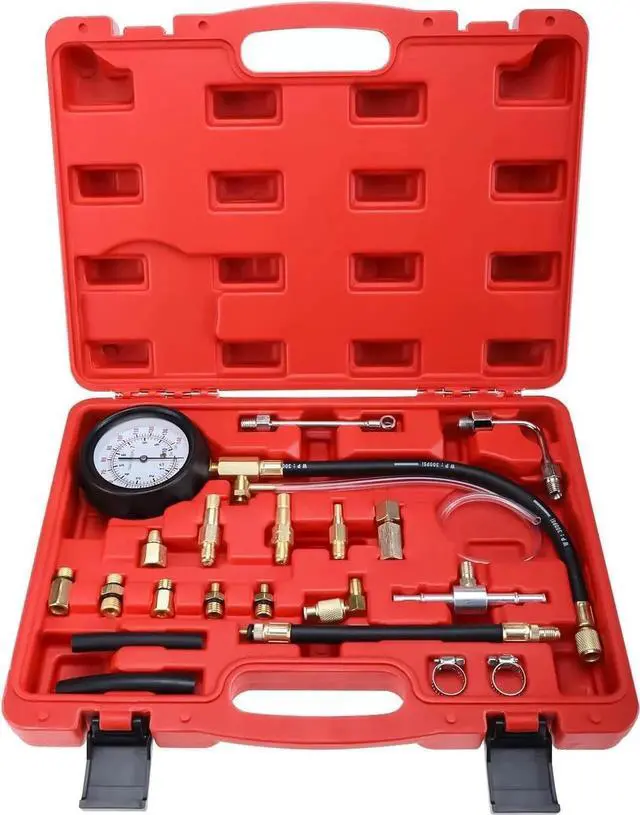 Safe Fuel Recovery: The gauge features a pressure relief valve on the side and a long drain hose for safe fuel recovery.