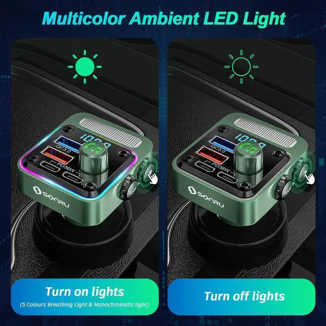 ![Alt view image 7 of 7 - Bluetooth 5.3 FM Transmitter Car Adapter - SONRU Car Charger 54W [PD 36W & QC3.0 18W], Wireless FM Radio Transmitter [HiFi Treble & Bass Player], 5 Colors LED Backlit, Hands-Free Calling, U-Disk](https://c1.neweggimages.com/productimage/nb640/C3S5D2601050Y47UEF9.jpg)