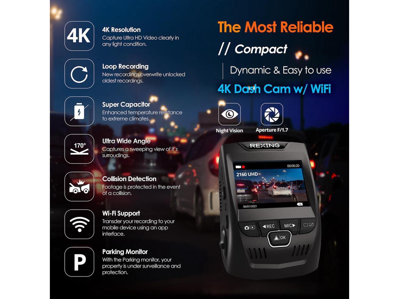 Rexing V1-4K Ultra HD Car Dash Cam 2.4" LCD Screen, Wi-Fi, 170° Wide Angle Dashboard Camera Recorder with G-Sensor, WDR, Loop Recording, Supercapacitor, Mobile App, 256GB Supported