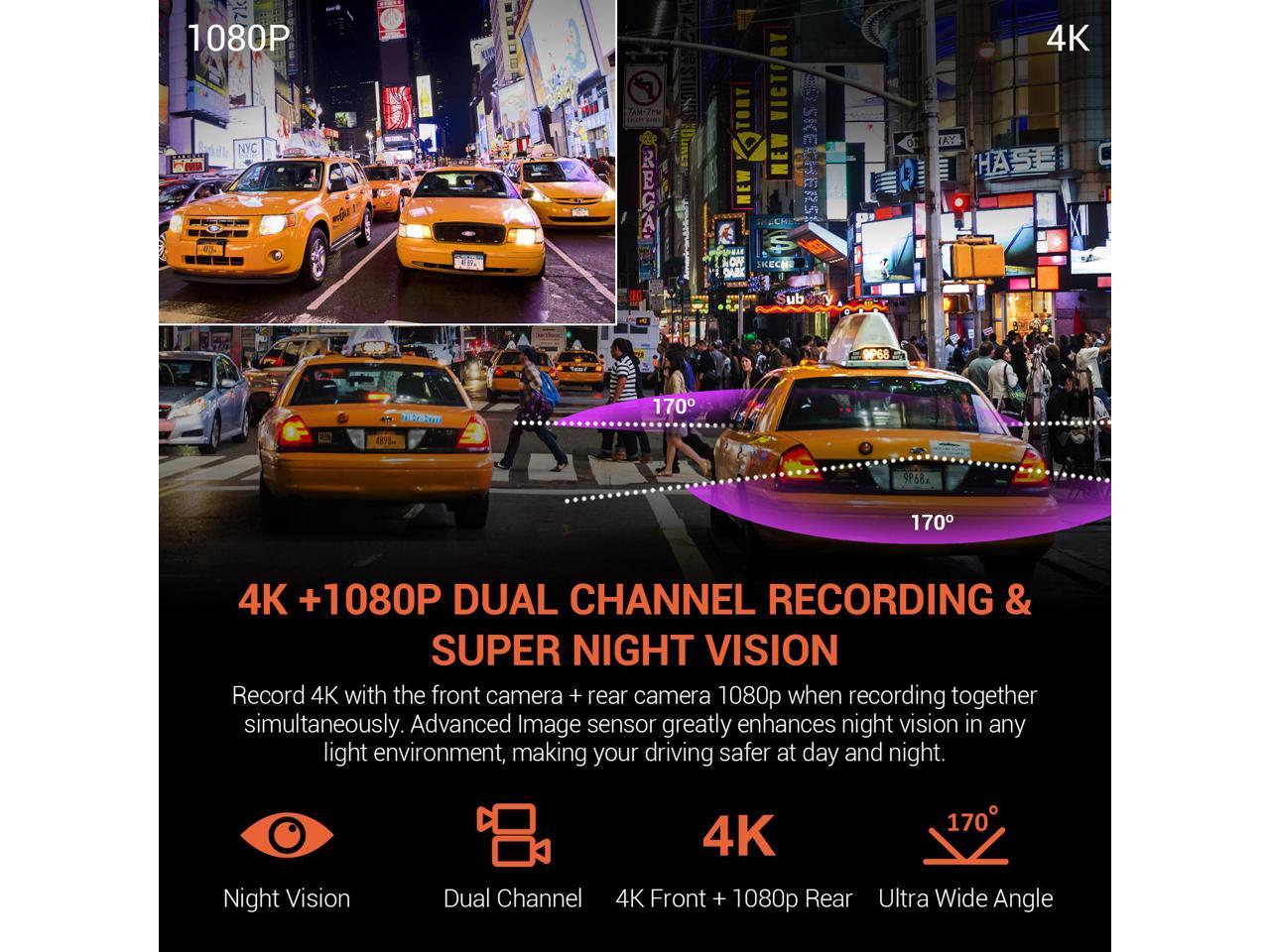 - 4K DUAL CHANNEL RECORDING - Best FRONT & REAR camera, records REAL 4K Front + Rear 1080p. Simultaneously record and display the road in front and the road behind you with the camera and LCD screen. Enhanced night vision also allows the dash cam to perform well in low-light situations by 6 glass lens carefully fine-tuning the exposure along with 170 DEGREE Ultra Wide Angle lenses.